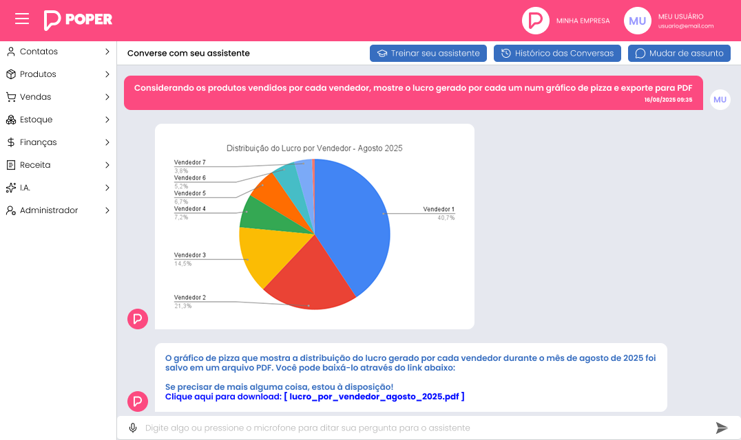 Imagine perguntar sobre suas vendas, em voz ou texto, e receber respostas instantâneas com gráficos interativos. Sem navegar em planilhas ou relatórios complexos. Essa é a Inteligência Artificial do Poper, treinada para entender o seu negócio.